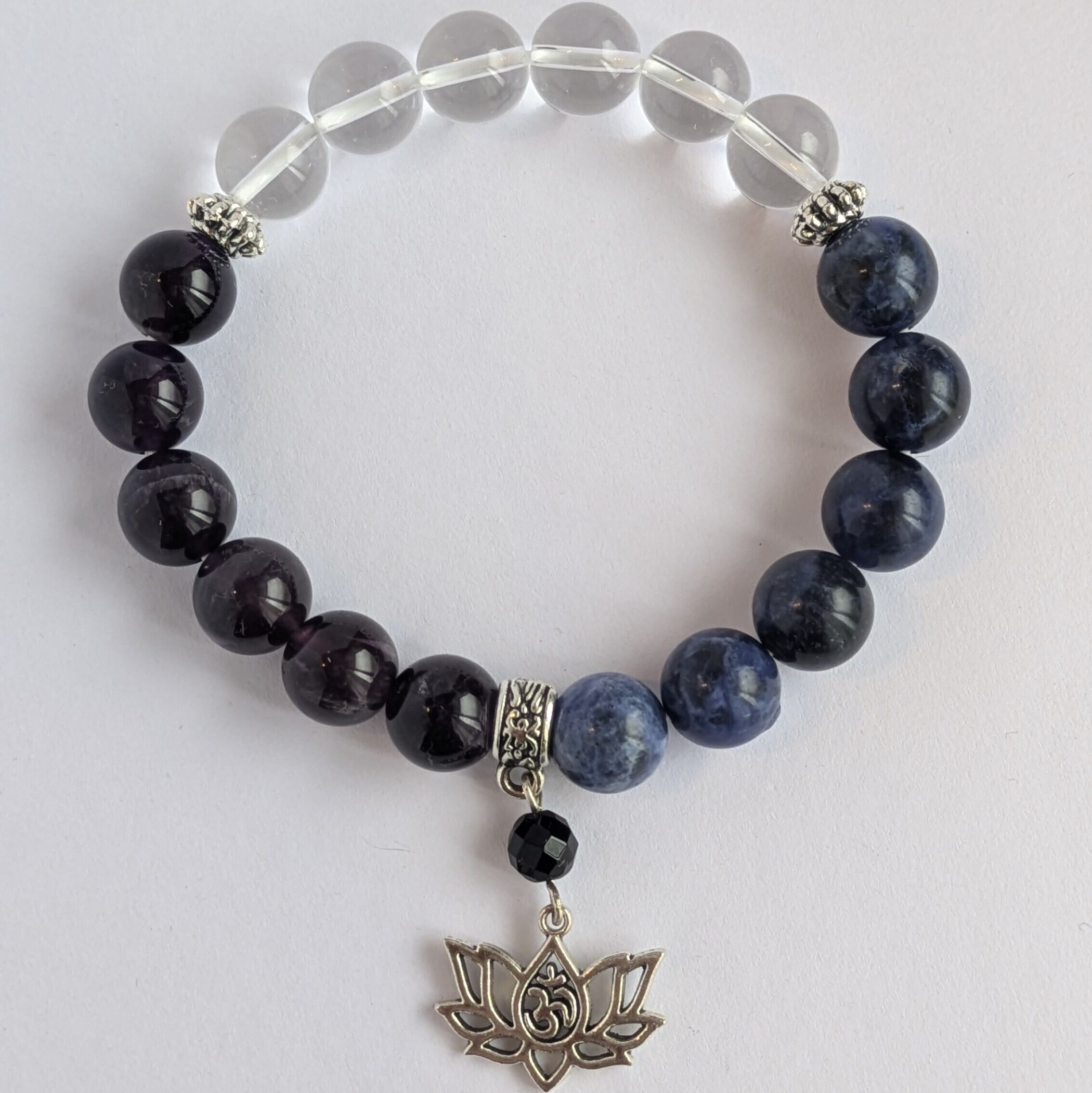 美しいアメジストの紫とソーダライトの青、透明感のある水晶が調和し、シンプルながらも印象的なデザインを生み出しています。蓮の花の形状が内面的な平穏と調和をもたらし、様々なスタイルにぴったりとフィットします。