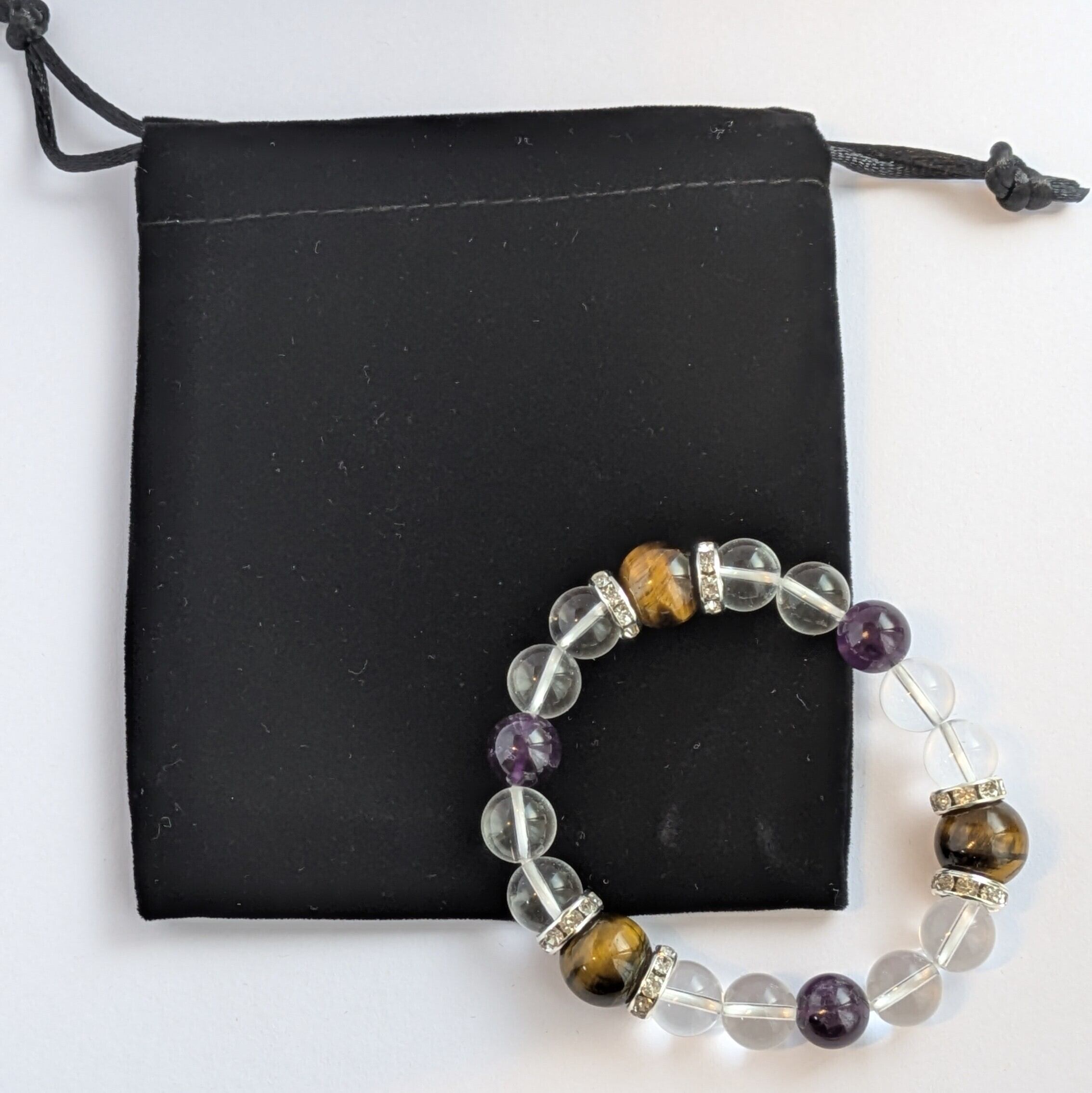 美しいゴールドブラウンのタイガーアイ、クリアな水晶、優しい紫色のアメジストが調和し、シンプルながらも魅力的なデザインです。タイガーアイをベースに主張しながらも、水晶の割合が多いので透明感のある爽やかな印象を意識。サイズは16cmで伸縮性のあるゴムを使用し、性別やスタイルを問わずフィットします。